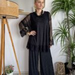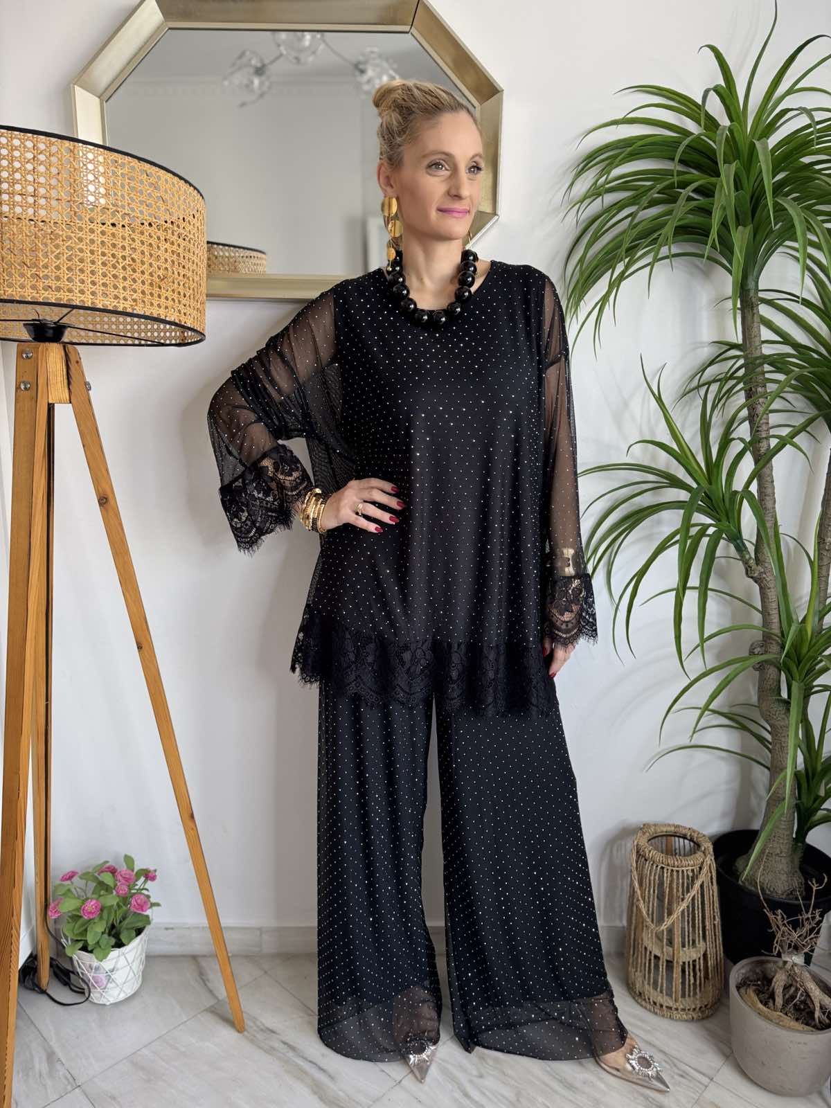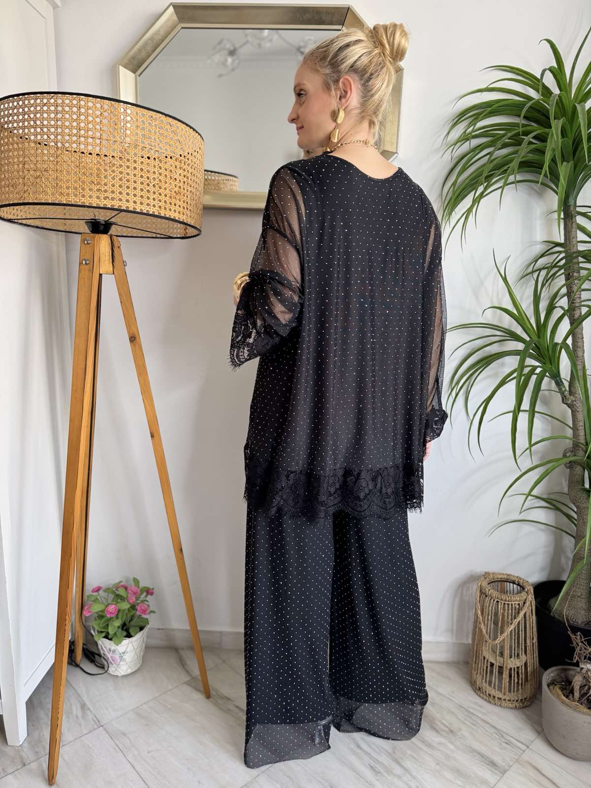 👖 Παντελόνα ψηλόμεση με τούλινη διαφάνεια και στρας, διαθέτει εσωτερική φόδρα και λάστιχο στη μέση για τέλεια, άνετη εφαρμογή!