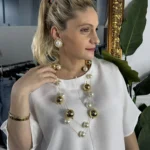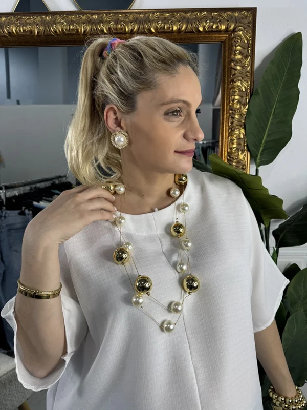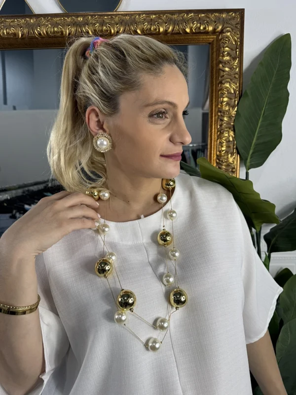 Μακρύ χρυσό κολιέ με λευκές & χρυσές πέρλες.